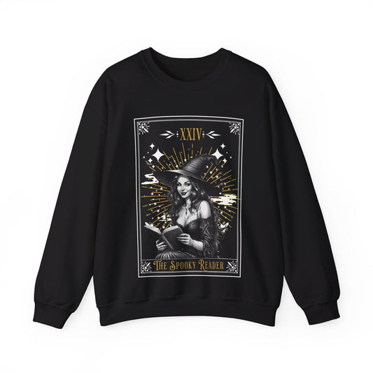 "The Spooky Reader" Halloween Witch Graphic Sweater | Cozy Black Crew Neck for Book Lovers | Witchy Fall Reading Apparel
