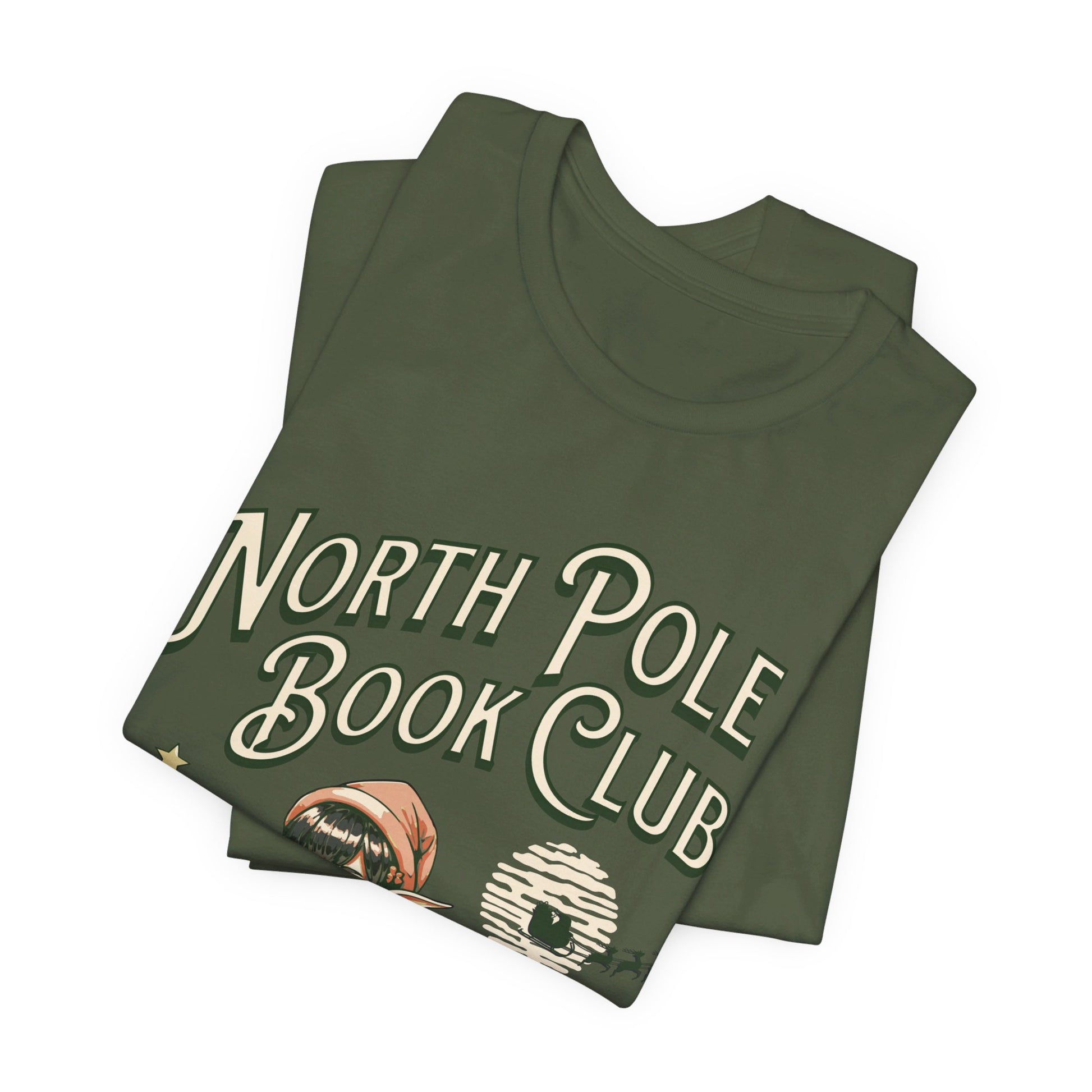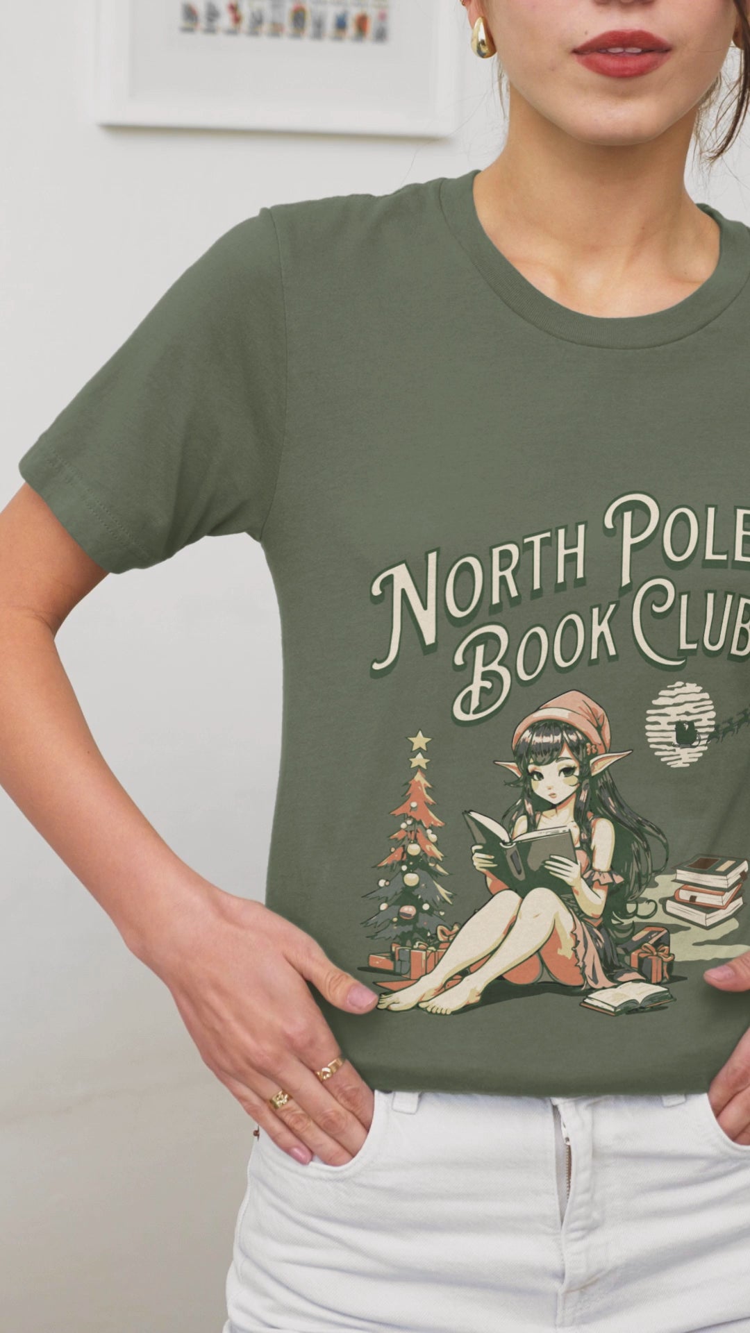 Army Green North Pole Book Club Crewneck with Coquette Elf, Comfy T-Shirt