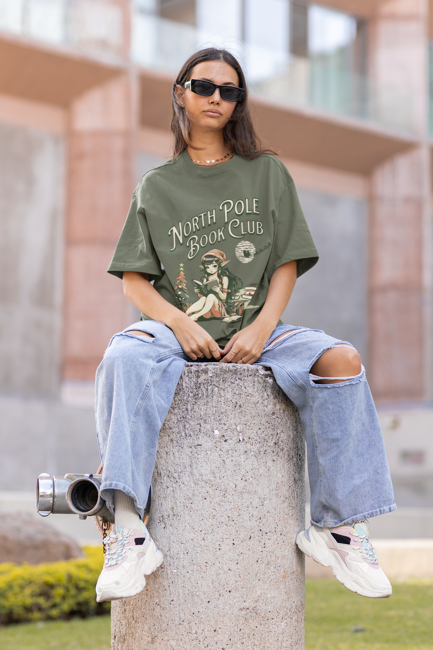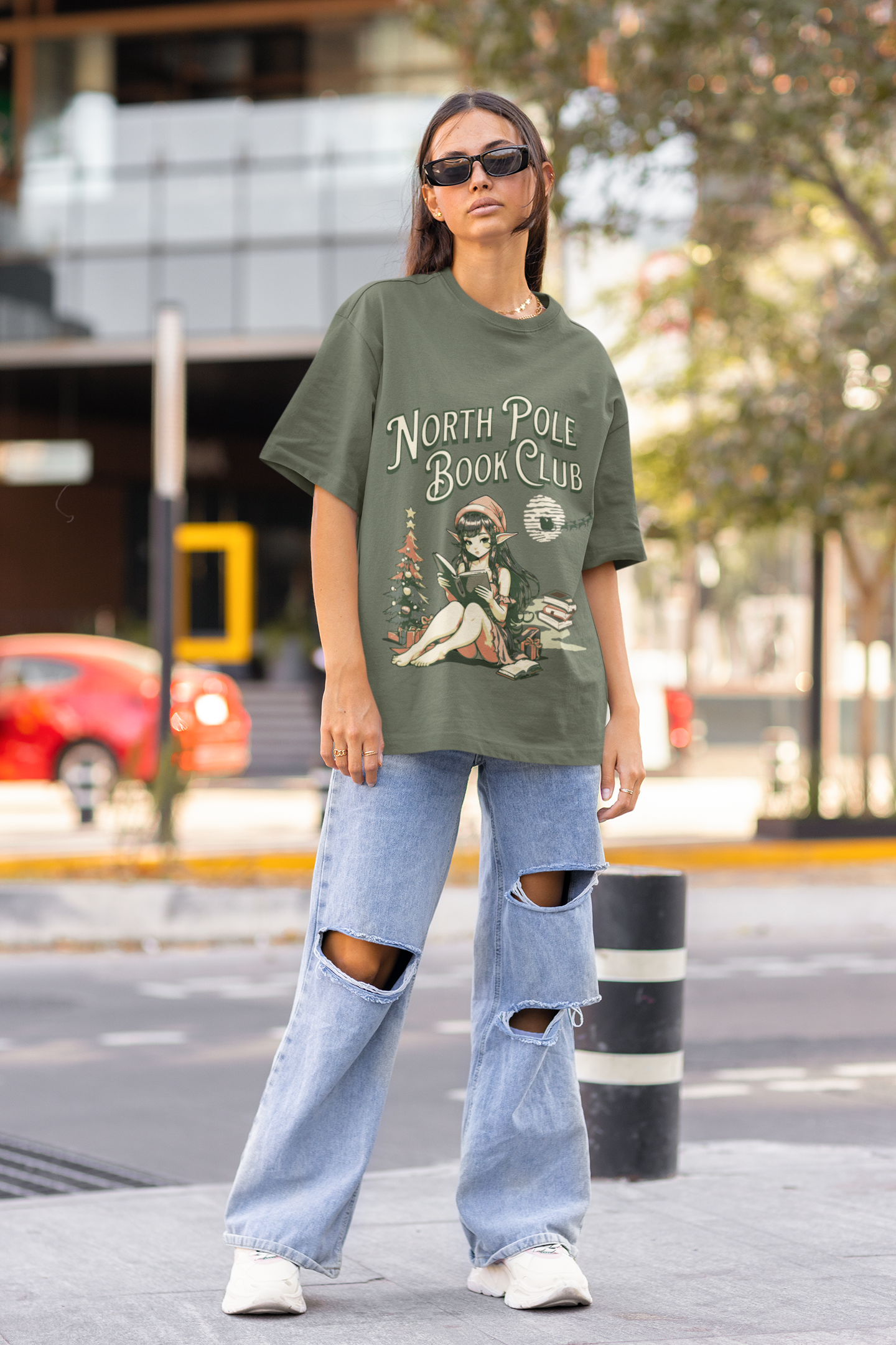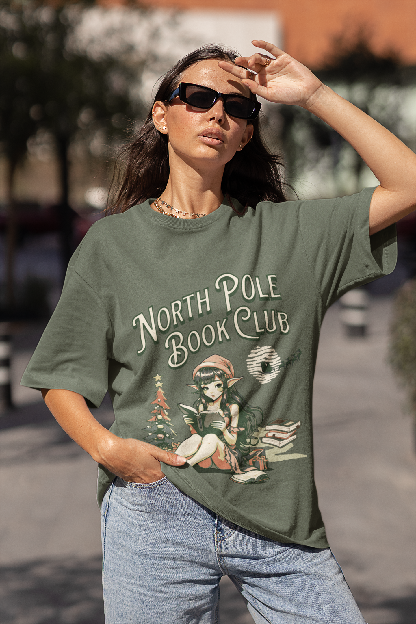 Get into the holiday spirit with our "North Pole Book Club" t-shirt in a stylish army green! This comfy tee features a charming coquette elf on the front, adding a playful and festive touch to your wardrobe. Made from soft, breathable fabric, it’s perfect for layering or wearing on its own during cozy winter days. Whether you’re lounging with a book, attending a holiday gathering, or simply embracing the season’s magic, this t-shirt is a must-have for Christmas enthusiasts and book lovers alike.